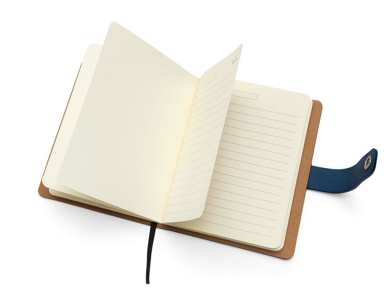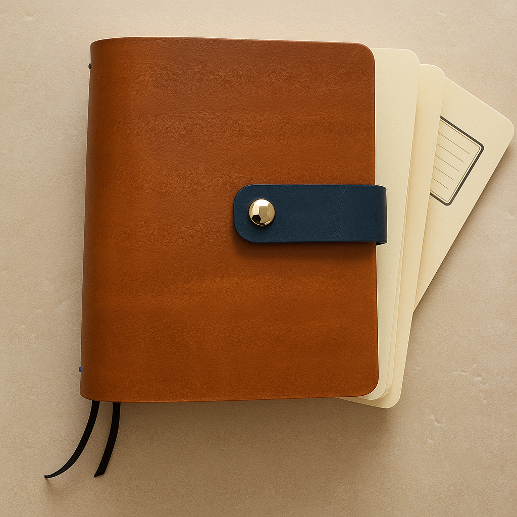 FLEXI ("M") - Linea Classica - 2026 - kožený doplniteľný zápisník/diár 2026, farebná kombinácia: svetlohnedá s tmavomodrými doplnkami - zápisník sa uzatvára na magnetický patent